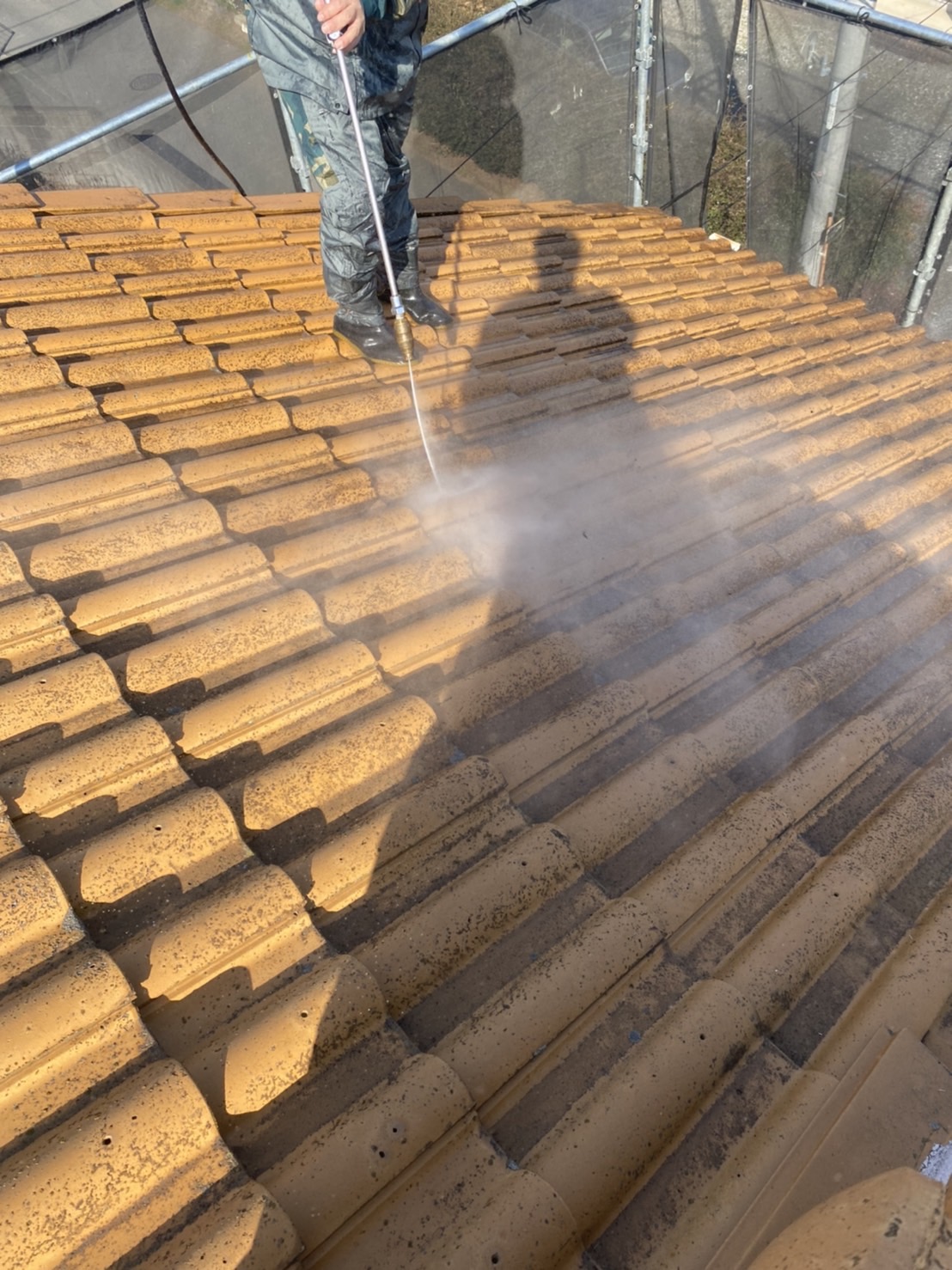 エンジン式の高圧洗浄機を使用し、外壁・屋根についた汚れを丁寧に落としていきます。
